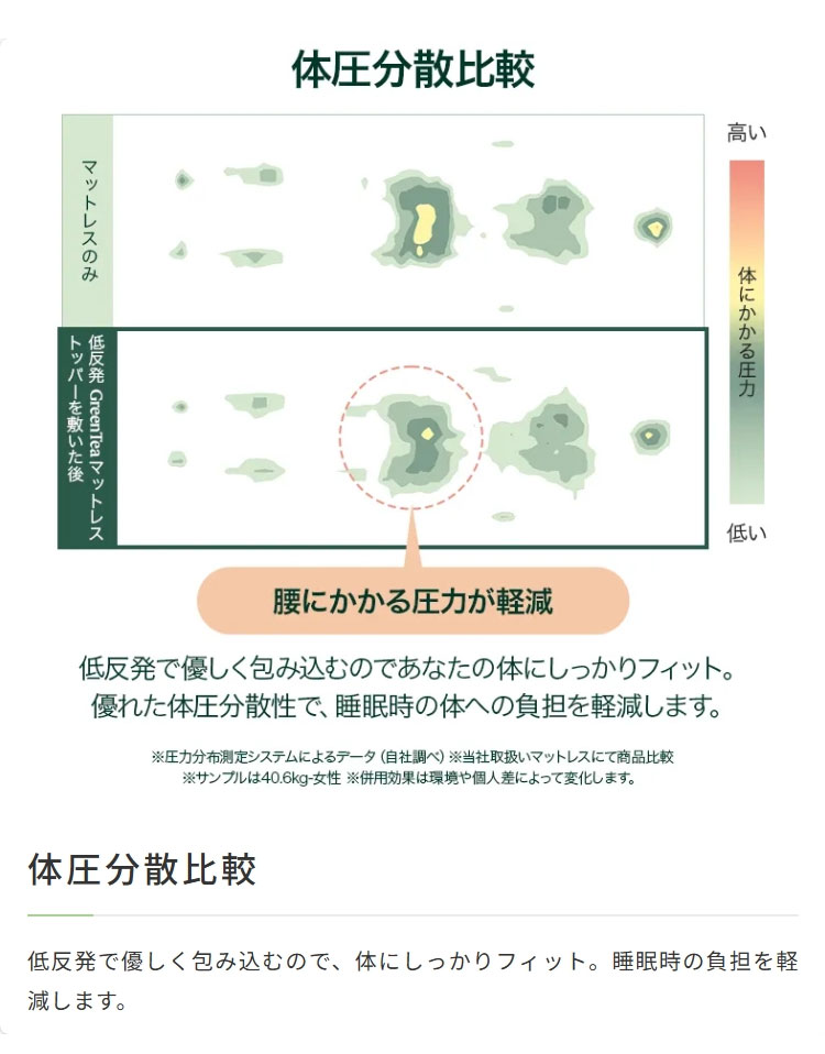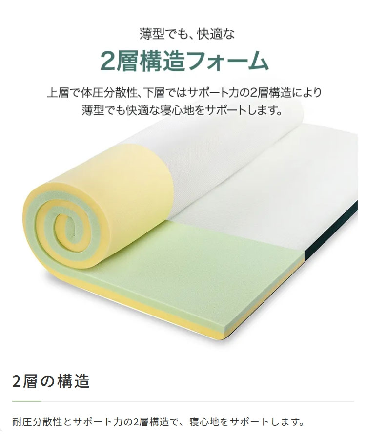 抗菌効果もある緑茶成分配合GreenTea(グリーンティー)シリーズの低反発ウレタン素材のトッパーです。