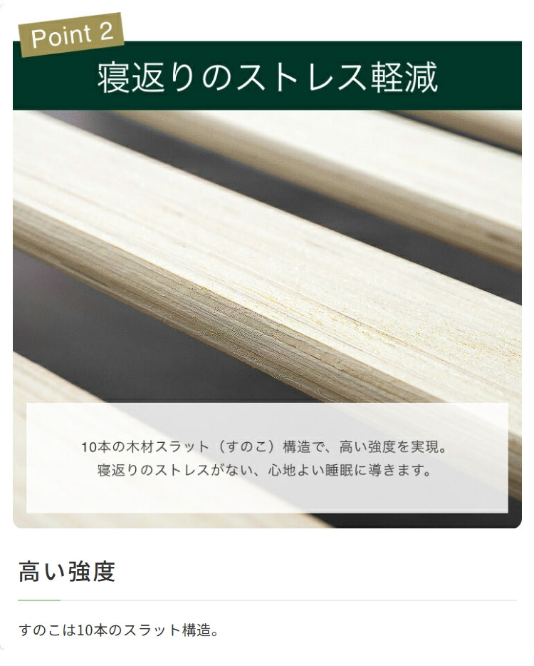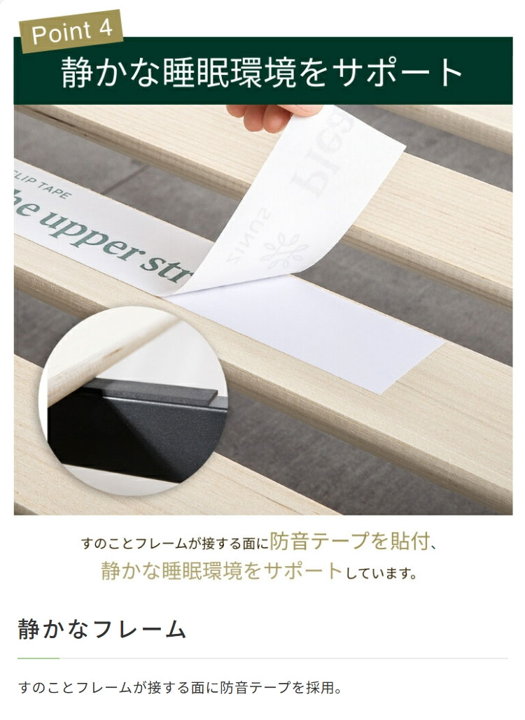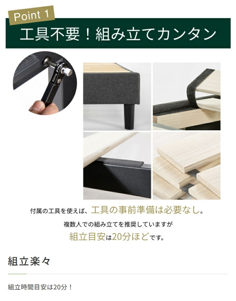 | 機能 | ●耐荷重(推奨:約) シングル : 120 kg セミダブル : 180 kg ダブル : 180 kg ●組立品(工具付属) ※必ず17cm以上のスプリングマットレスを乗せて使用してください。 ※寝具やクッション、撮影に使用している小物等は付属しません。 ※モニター・画面環境・照明などにより、実際の色味と見え方が異なる場合がございます。予めご了承ください。 |