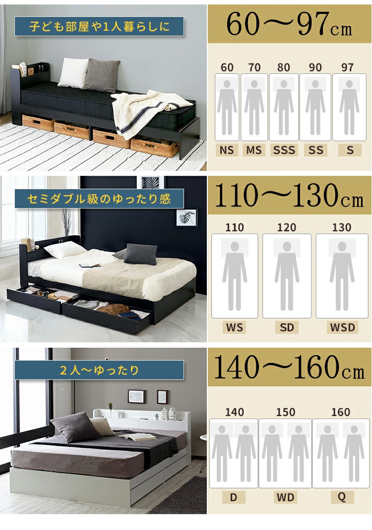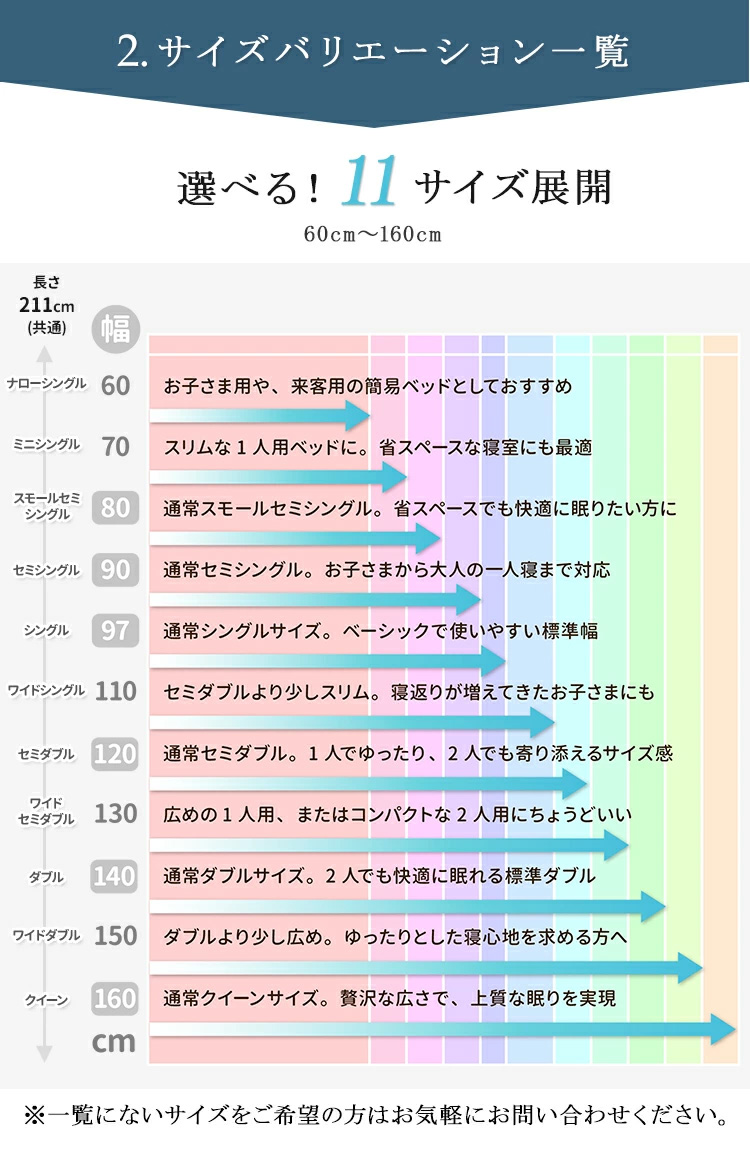 ナローシングルからクイーンまで、あなたにちょうどいいサイズがきっと見つかります。