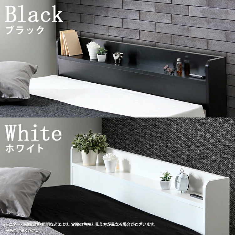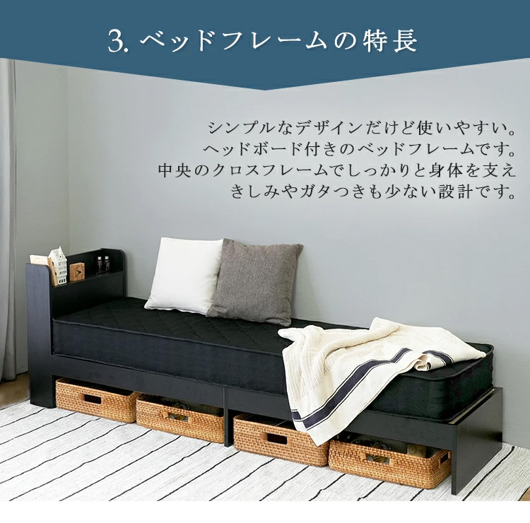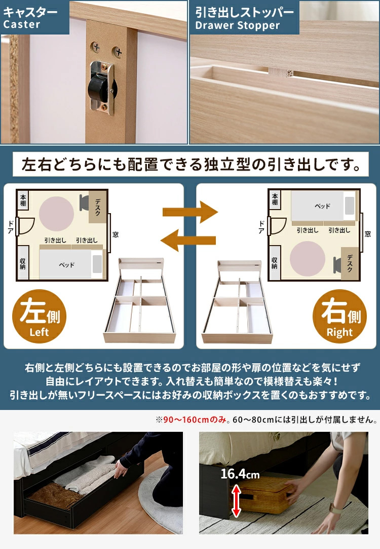 機能 | ●組み立て式 ●ヘッドボード棚 ●キャスター付き引出し2杯(90cmサイズ以上) ●コンセント 120cmサイズまで:2口コンセント 130cmサイズから:1口コンセント×2個(両端1個ずつ) ●巾木よけ ●130cmサイズから、中央連結仕様 |