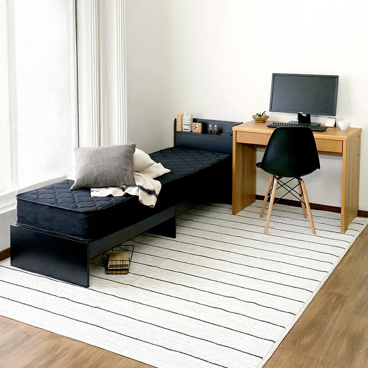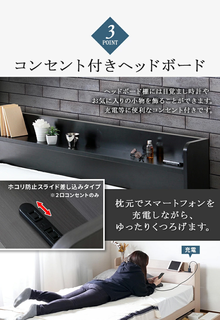 衣類を収納できる引き出し、スマホを置けるヘッド棚やコンセント、傷や水に強いメラミン素材など、毎日の「あると助かる」を凝縮。