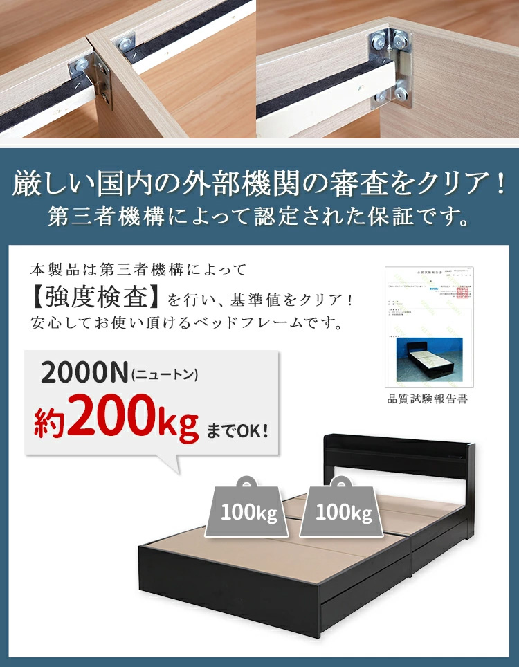 サイズ | 【本体サイズ(約)】 ナローシングル(60cm):(約)幅60×長さ211×高さ70cm ミニシングル(70cm):(約)幅70×長さ211×高さ70cm スモールセミシングル(80cm):幅80×長さ211×高さ70cm セミシングル(90cm):(約)幅90×長さ211×高さ70cm シングル(97cm):(約)幅97×長さ211×高さ70cm ワイドシングル(110cm):(約)幅110×長さ211×高さ70cm セミダブル(120cm):(約)幅120×長さ211×高さ70cm ワイドセミダブル(130cm):(約)幅130×長さ211×高さ70cm ダブル(140cm):(約)幅140×長さ211×高さ70cm ワイドダブル(150cm):(約)幅150×長さ211×高さ70cm クイーン(160cm):(約)幅160×長さ211×高さ70cm 床面高さ:26.5cm 床板厚み:3.4cm --------------------------- サイズごとに床板の枚数が変わります。 97cmサイズまで:4枚 110cmサイズから:8枚 --------------------------- ◆引き出し(90cmサイズから) (約)幅95×奥行40.5×高さ14cm ◆引き出し内寸(90cmサイズから) (約)幅91×奥行37×高さ8.5cm 【梱包サイズ(約)】 ナローシングル(60cm) 2-1 (約)幅65×長さ52×高さ10cm / 2-2 幅103×長さ30.5×高さ21cm ミニシングル(70cm) 2-1 (約)幅72×長さ52×高さ10cm / 2-2 幅103×長さ30.5×高さ21cm スモールセミシングル(80cm) 2-1 (約)幅82×長さ52×高さ10cm / 2-2 幅103×長さ30.5×高さ21cm セミシングル(90cm) 2-1 (約)幅92×長さ52×高さ10cm / 2-2 幅103×長さ30.5×高さ21cm シングル(97cm) 2-1 (約)幅97×長さ52×高さ10cm / 2-2 幅104×長さ28×高さ20cm ワイドシングル(110cm) 3-1 (約)幅60×長さ52×高さ16.5cm / 3-2 幅114×長さ28×高さ9cm / 3-3 幅103×長さ30.5×高さ11cm セミダブル(120cm) 4-1 (約)幅64×長さ51×高さ16.5cm / 4-2 幅124×長さ28×高さ5cm / 4-3 幅102×長さ40×高さ12cm / 4-4 幅121×長さ14.5×高さ9cm ワイドセミダブル(130cm) 3-1 (約)幅68×長さ51×高さ16.5cm / 3-2 幅103×長さ40×高さ10cm / 3-3 幅61×長さ30×高さ20cm ダブル(140cm) 3-1 (約)幅73×長さ51×高さ16.5cm / 3-2 幅101×長さ39.5×高さ210cm / 3-3 幅77×長さ30×高さ20.5cm ワイドダブル(150cm) 3-1 (約)幅78×長さ51×高さ16.5cm / 3-2 幅103×長さ40×高さ10cm / 3-3 幅71×長さ30×高さ20cm クイーン(160cm) 3-1 (約)幅84×長さ51×高さ16.5cm / 3-2 幅101×長さ39.5×高さ10cm / 3-3 幅87×長さ30×高さ20cm |